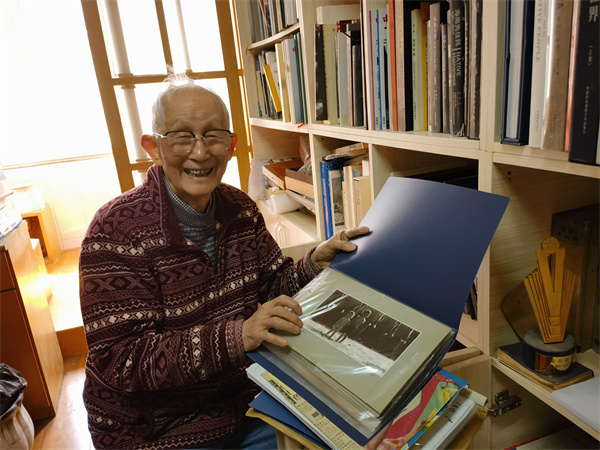 2025年3月21日,丁遵新先生在书房翻看摄影作品。邱晞 摄