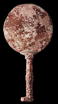 ◎ 曲贡墓地出土的铁柄铜镜。系中亚产品,约公元前7-8世纪。