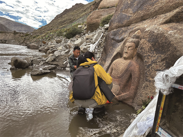 拉萨市文物普查队员次仁多吉、益西曲珍对热东摩崖造像进行数据采集。次仁多吉 摄